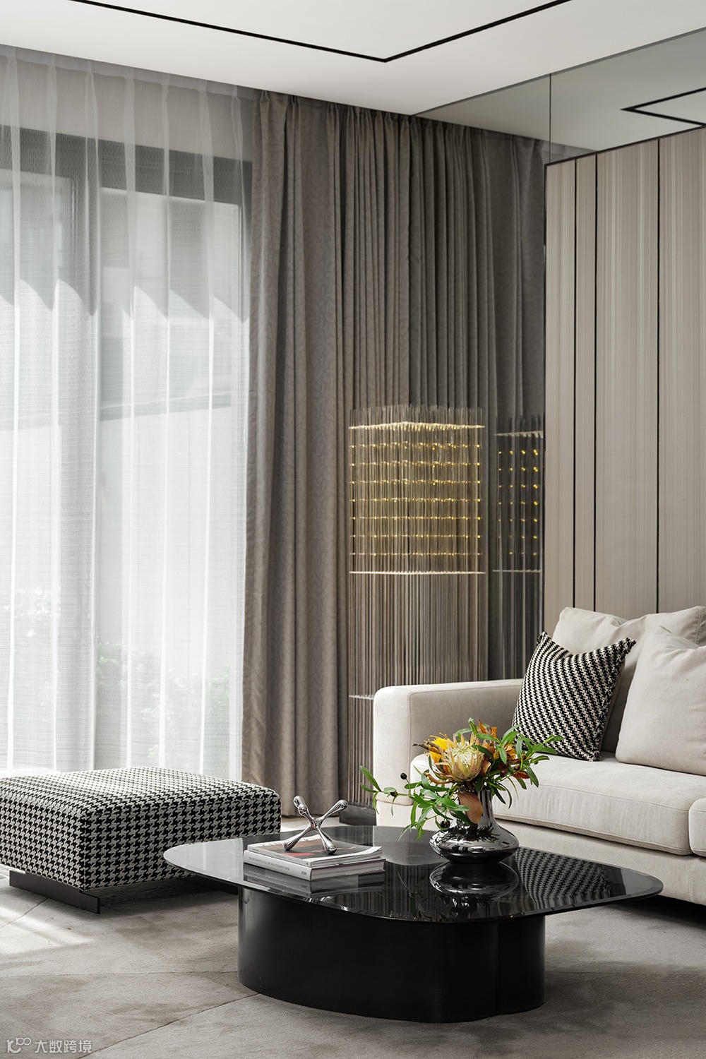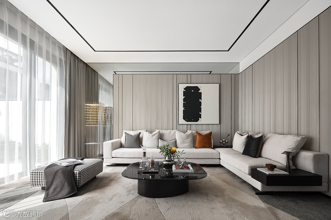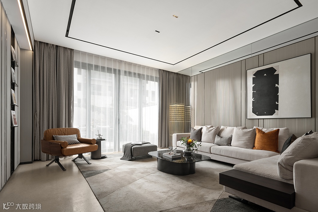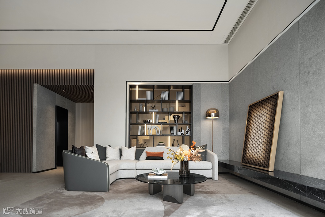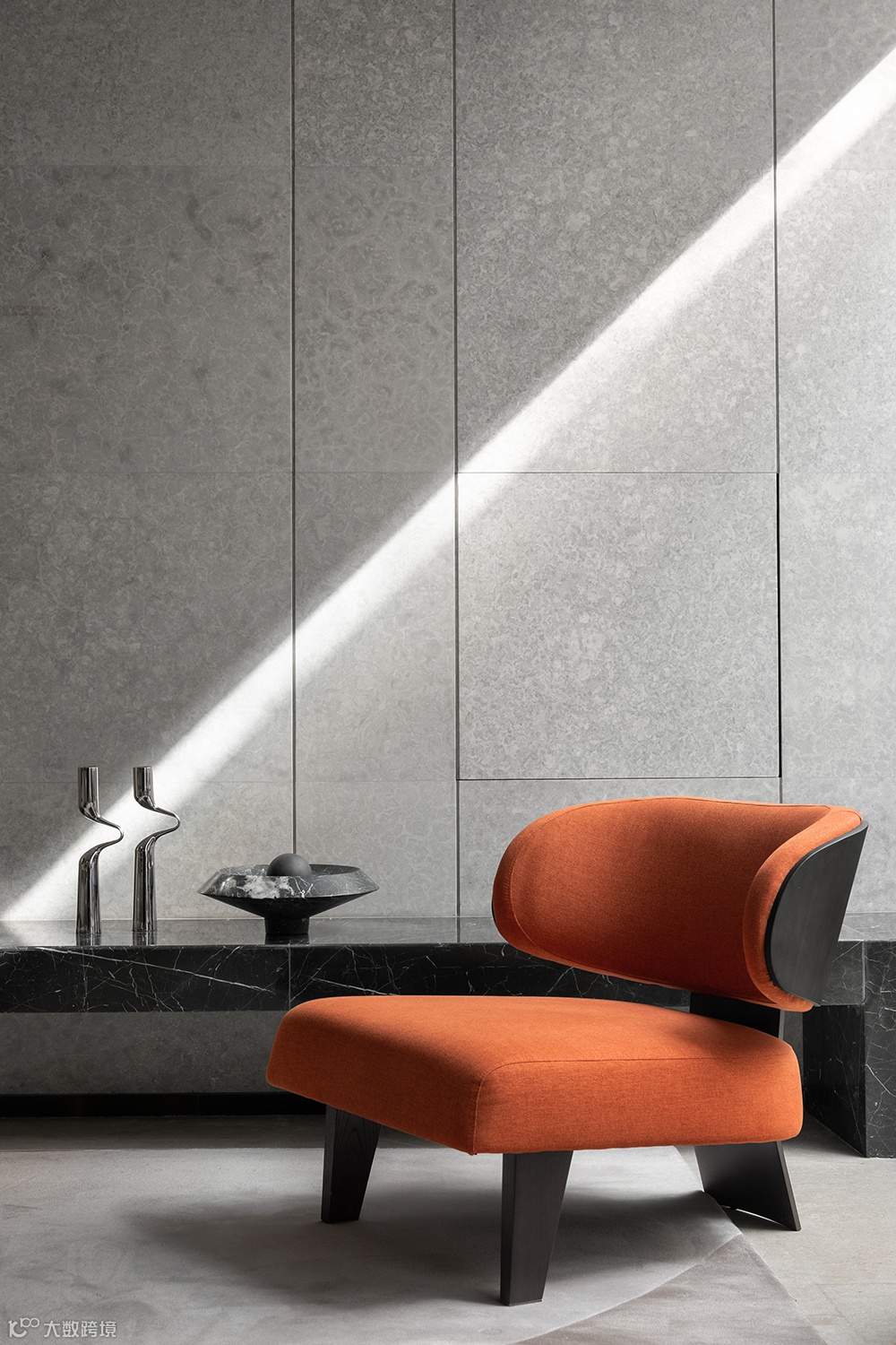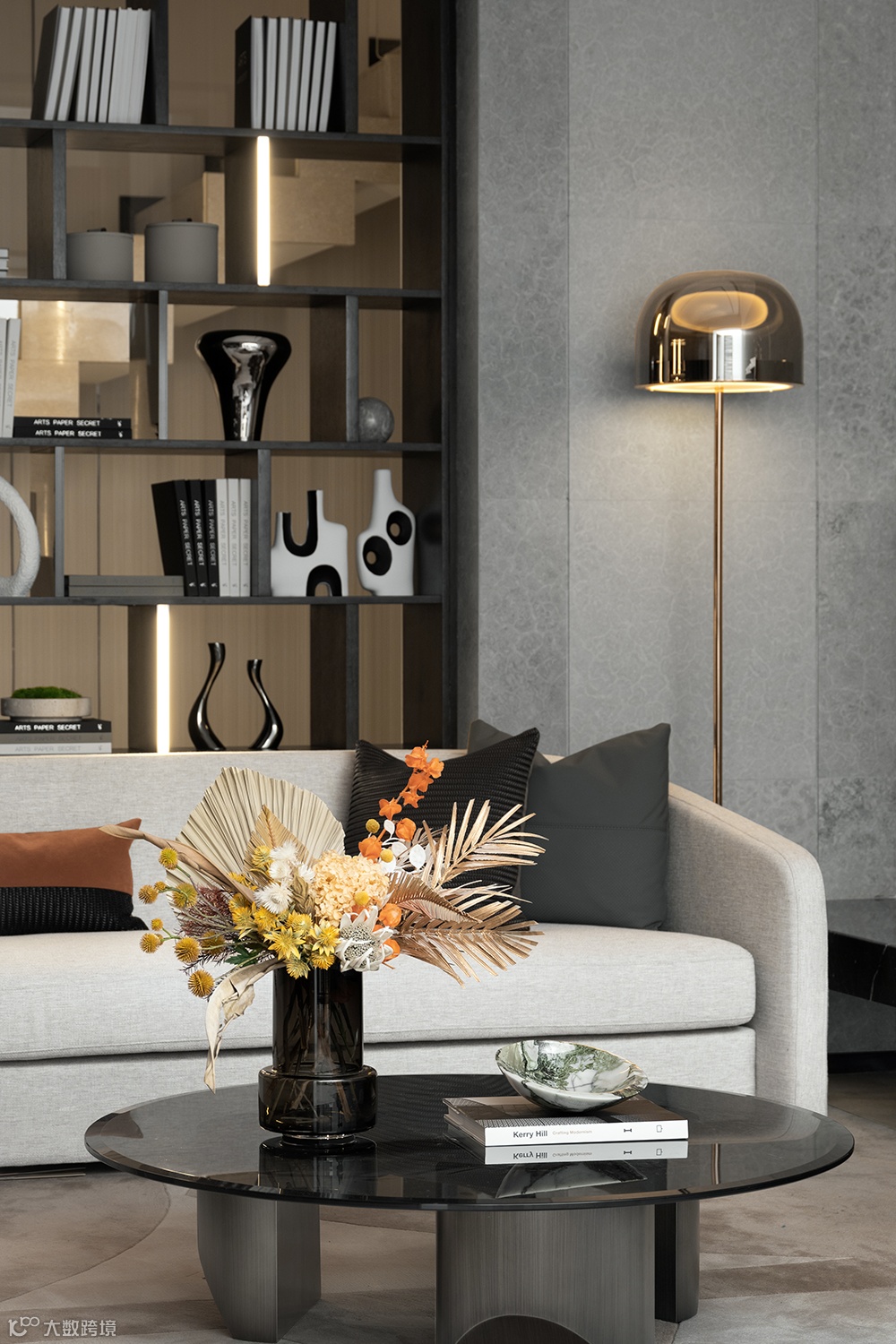 客厅,将都市优雅格调精炼为流畅的空间线条,淡雅灰调奠定舒盈视感,灵动橘色如投石入湖,激荡空间鲜活气场。