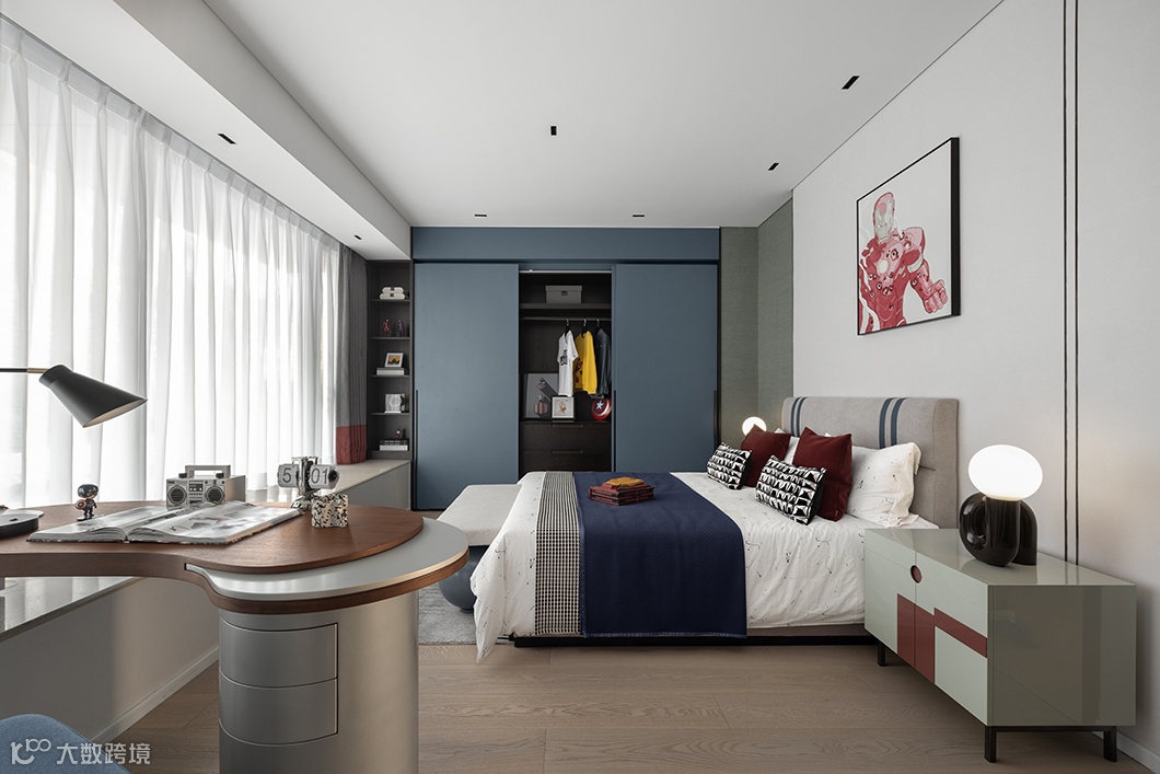 男孩房以明朗色彩呼应活力四射的青春。奇形书桌、床头灯,钢铁侠挂画,呈现消解了稚气的年轻感与英雄梦。