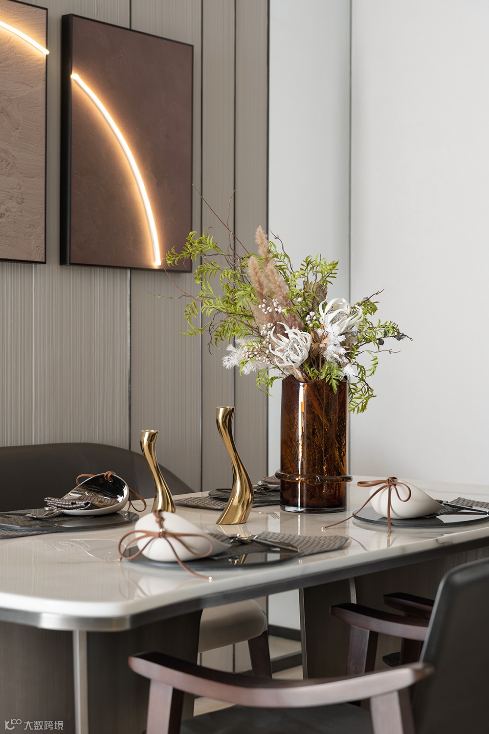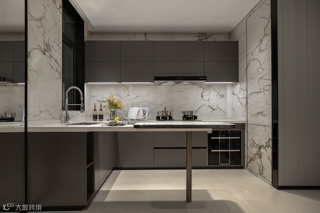 开放式餐厨空间,简练线条托起华美肌理,色调与材质呈现珠联璧合的叠加魅力,兼以艺术装饰调味精致细节。