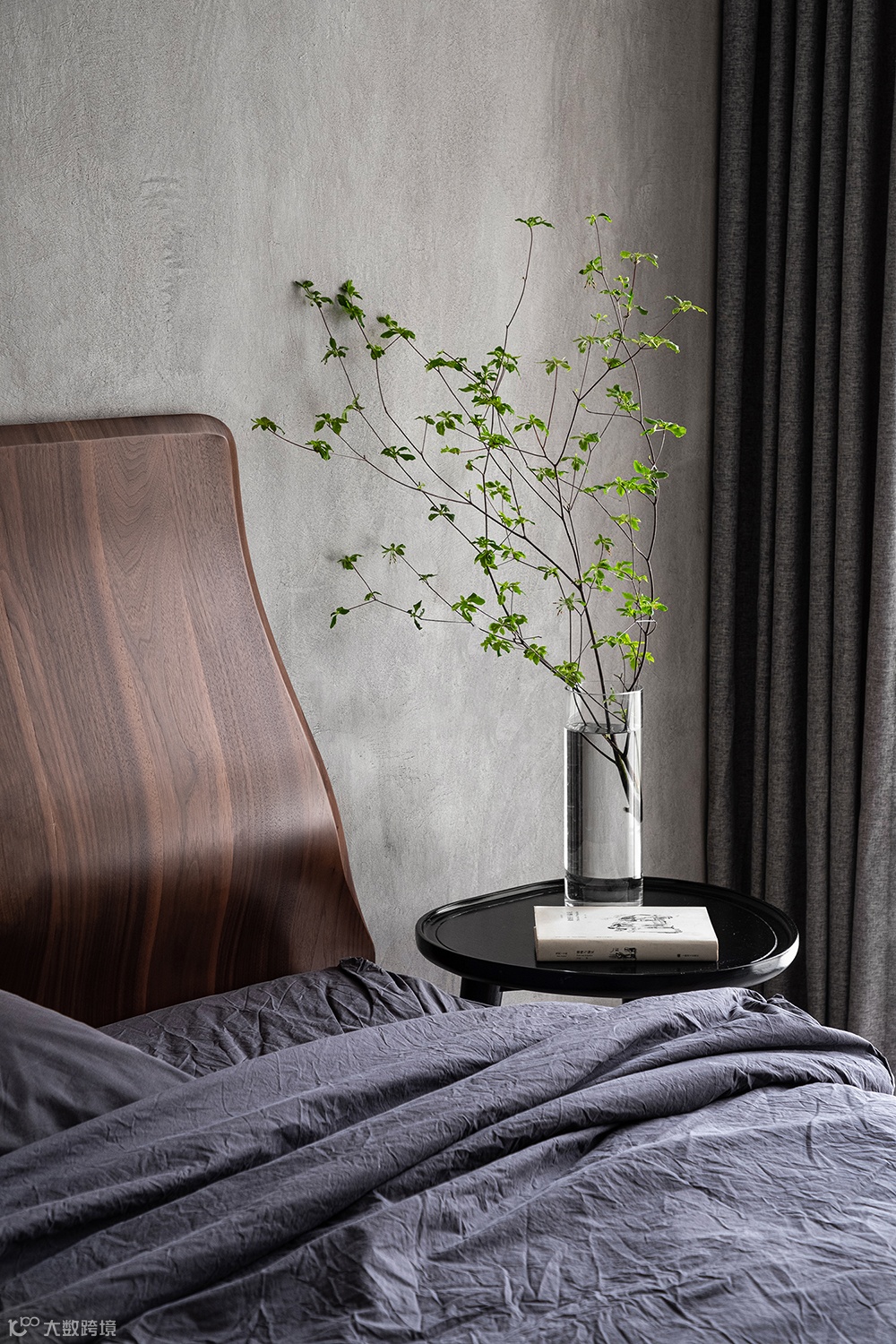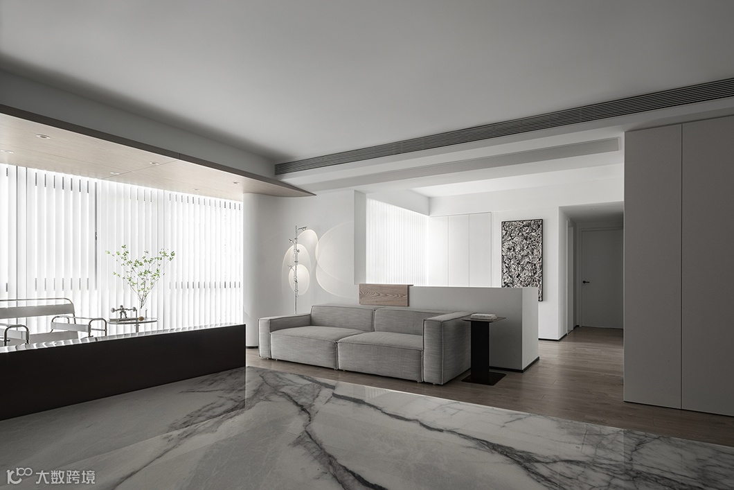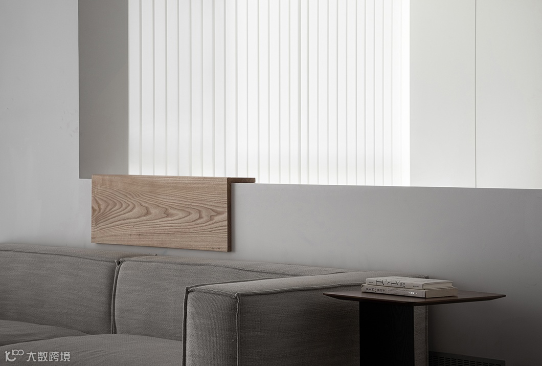 所谓细节之处方可见用心,沙发背后的半高墙体上加上一块原木隔板,符合设计师以局部木色作为点缀的初衷,也可以作为茶几的用途,看电视时随手放上一杯咖啡。