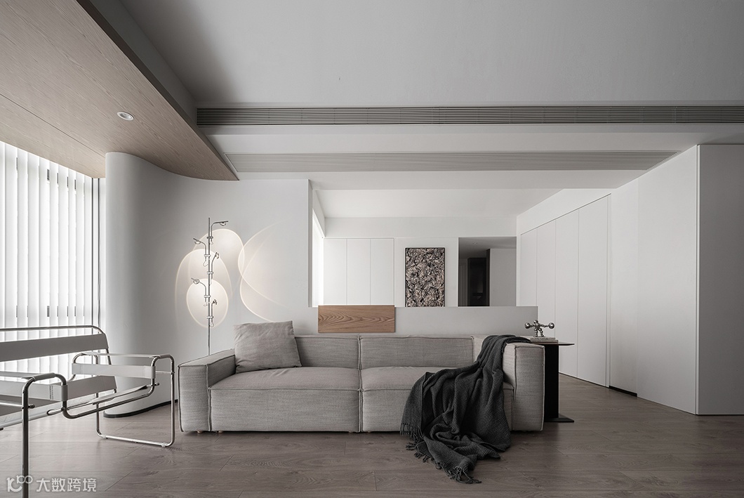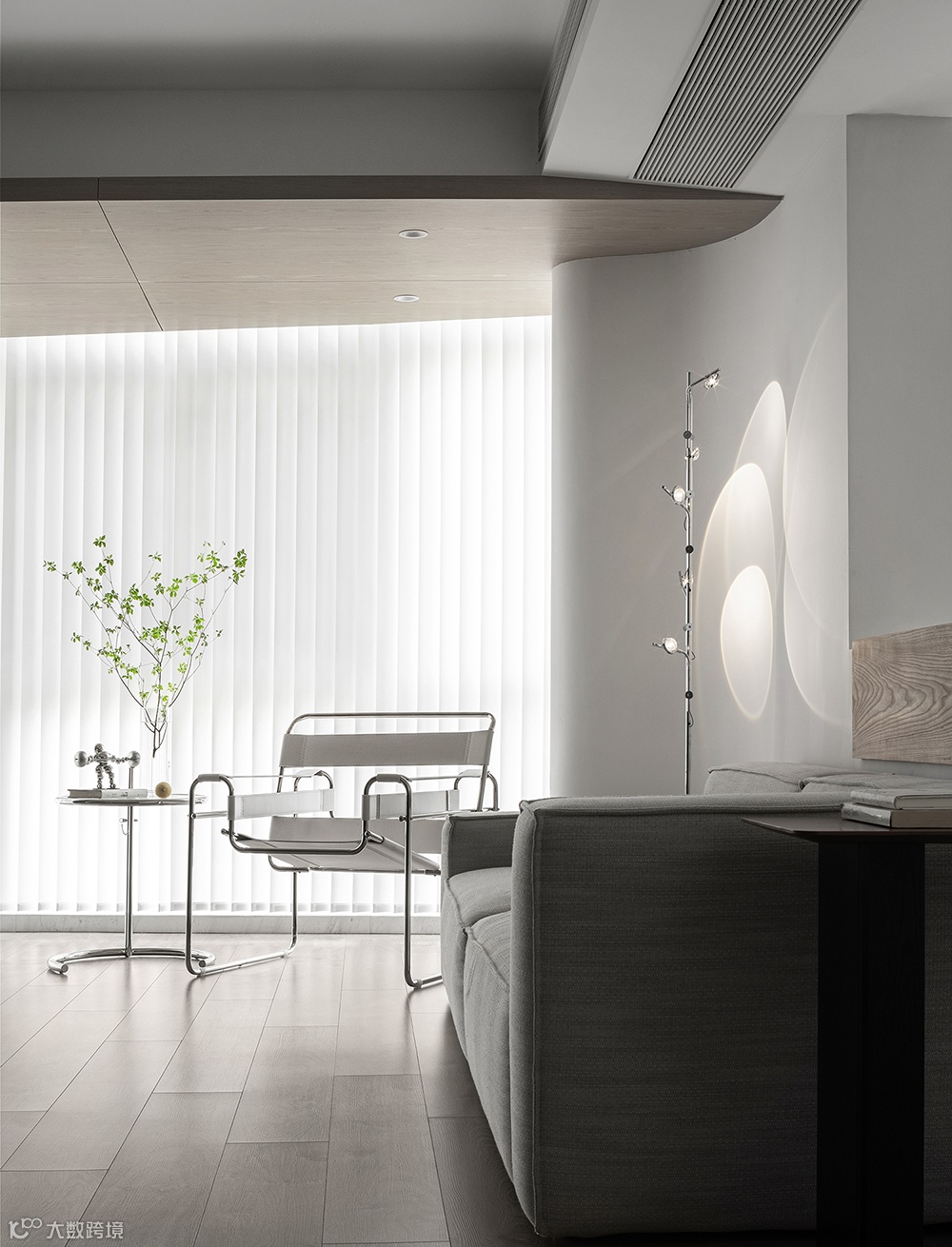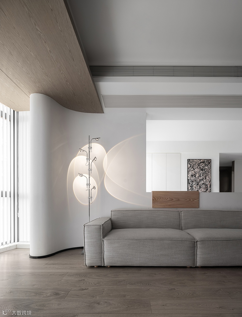 考虑到空间的通透性将这个不规则的阳台纳入到了客厅空间,设计师运用了弧形墙角设计搭配一盏光影灯来营造艺术感,撑起了客厅空间的柔和度的同时弱化了承重墙的存在感。