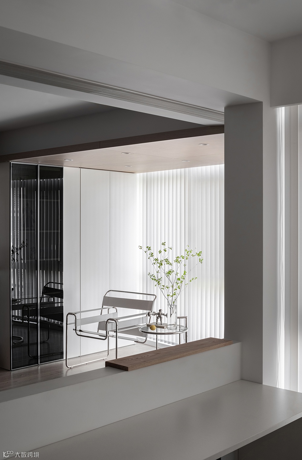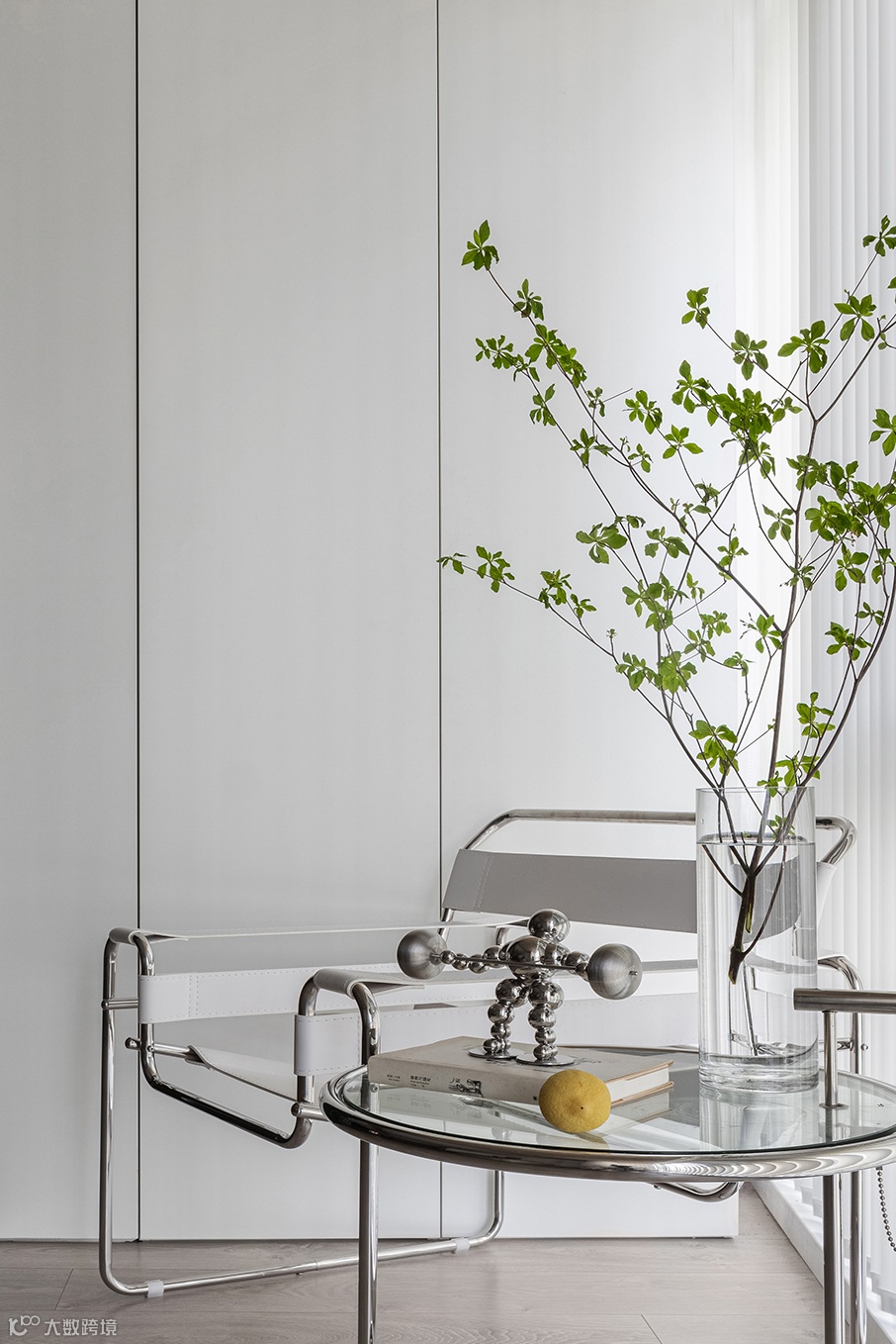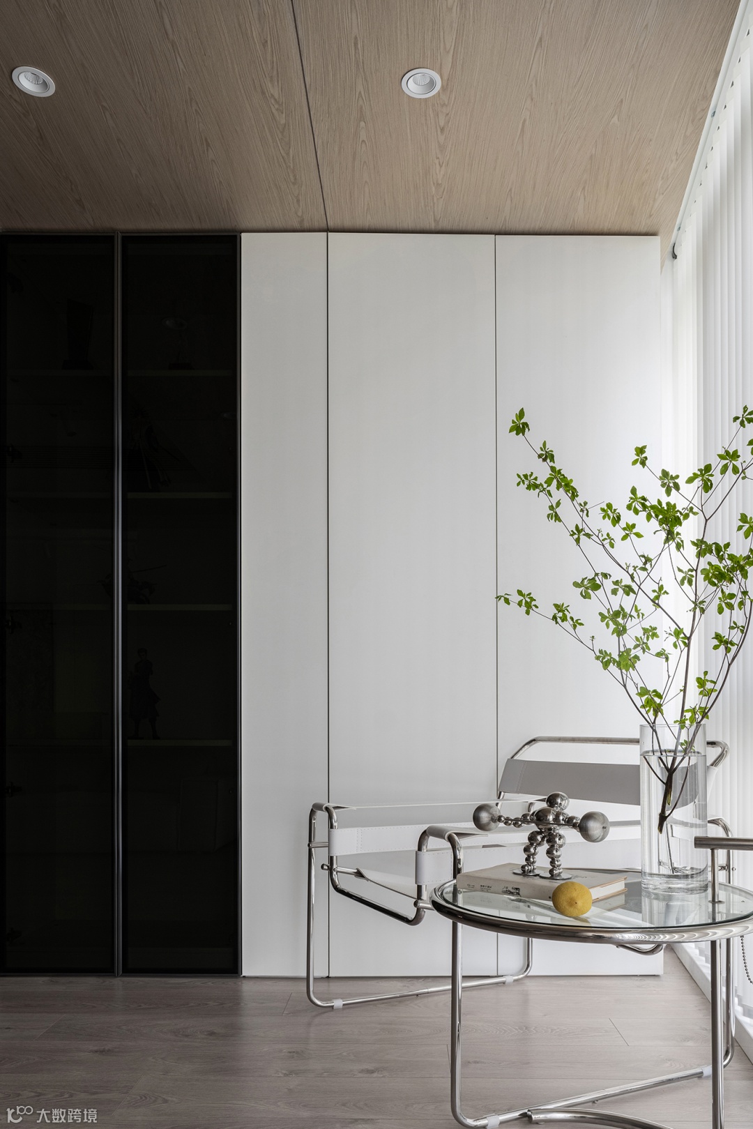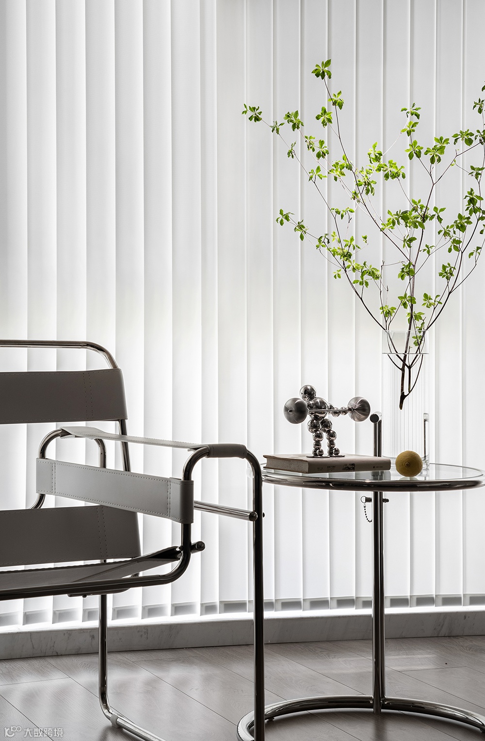 换个方向看向阳台一角,金属边框的单人椅与边几的冷峻与木饰面的温柔相得益彰,坐在落地窗边拉开梦幻的百叶窗帘,品一杯茶读一本书,偶尔看看窗外的街景,便是家中小朋友读书的学校,安心又惬意。
