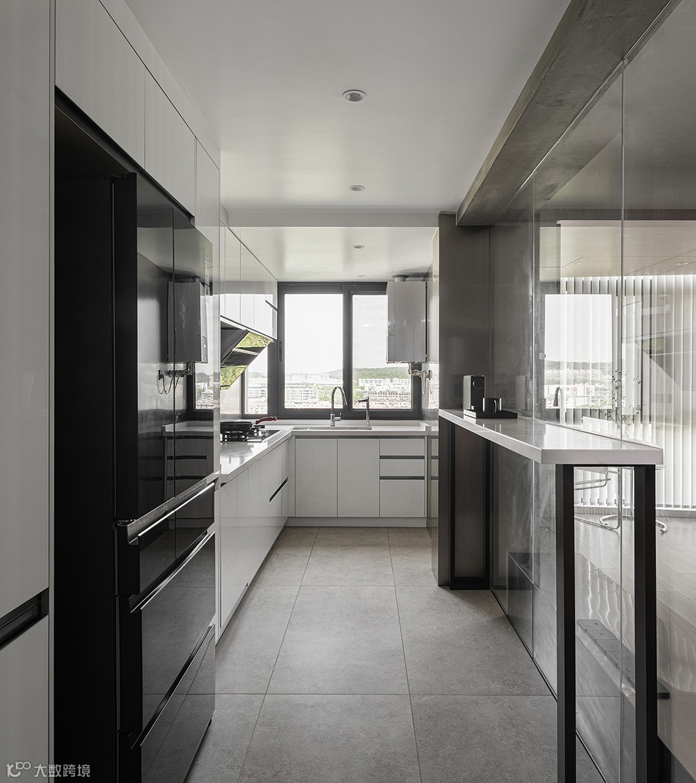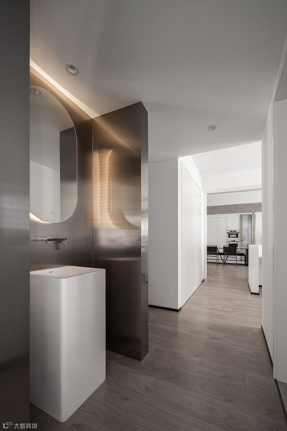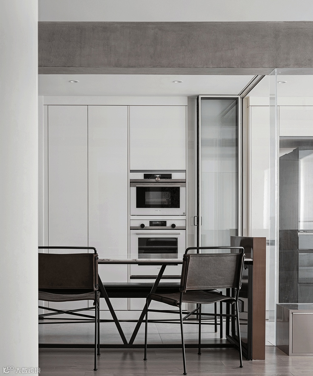 入户门的左侧结合墙体做了高柜,既可以作为入户收纳,也是厨房的收纳补充,充分考虑到了动线设计。