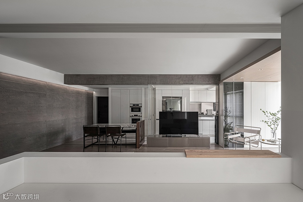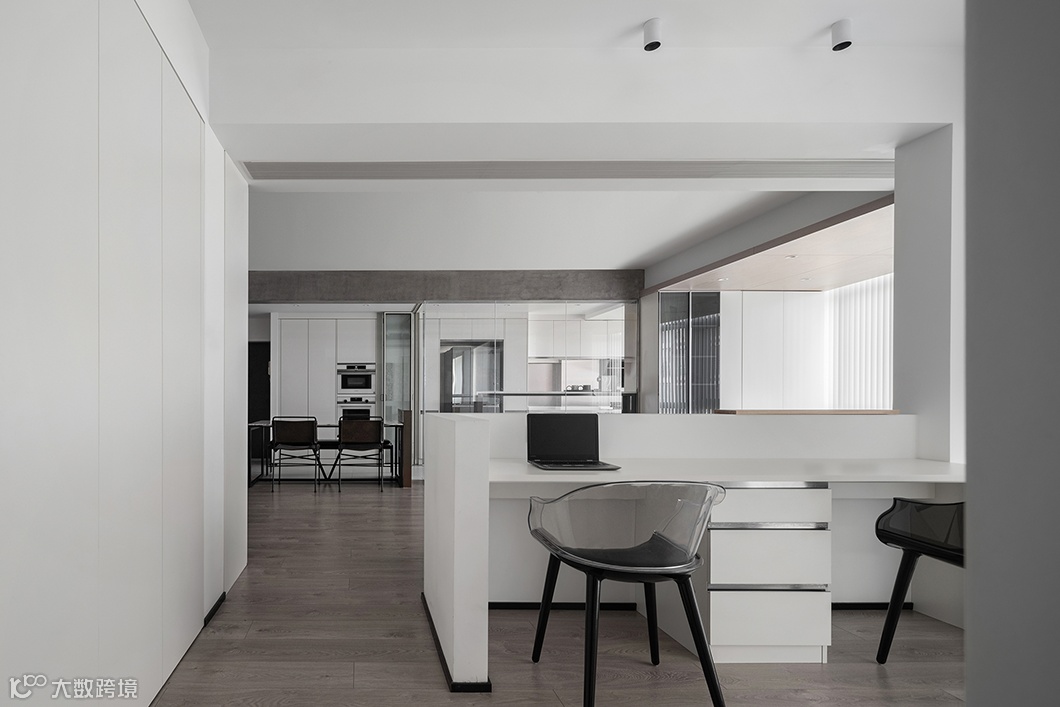 看向客厅,通透开阔的视觉效果,一眼纵览整个公共区域的全貌。白色与浅灰色柔和交融,搭配局部原木色的点缀,冷静中多了一丝的温柔,不需要多余的家具和装饰,尽可能留给孩子多一些活动区域。