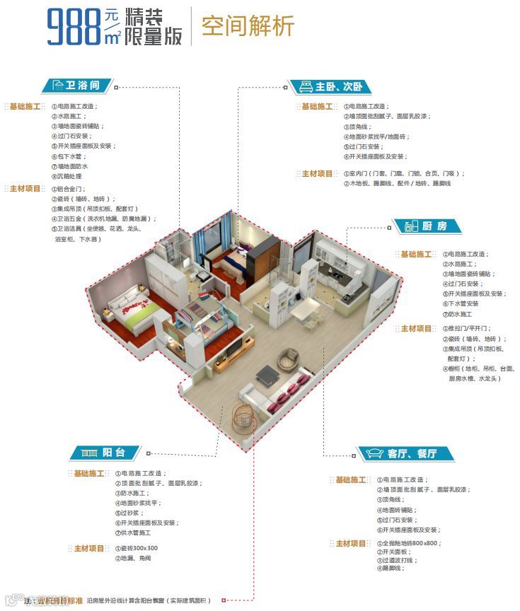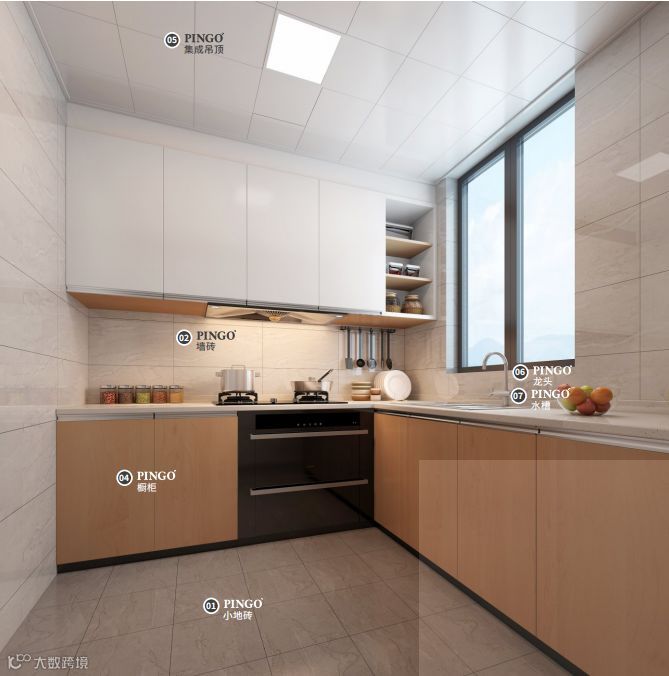 硬装主材:①推拉门/平开门;②瓷砖(墙砖、地砖);③集成吊顶(吊顶扣板、配套灯);④橱柜(地柜、吊柜、台面、厨房水槽、水龙头)