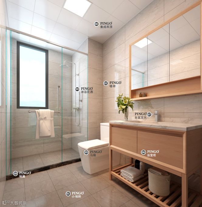 硬装主材:①铝合金门;②瓷砖(墙砖、地砖);③集成吊顶(吊顶扣板、配套灯)④卫浴五金(洗衣机地漏、防臭地漏);⑤卫浴洁具(坐便器、花洒、龙头、浴室柜、下水器)