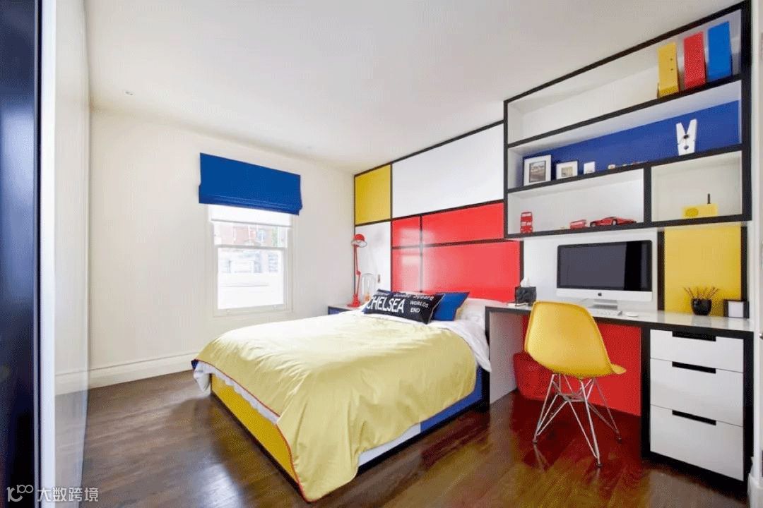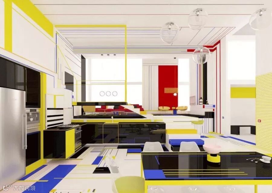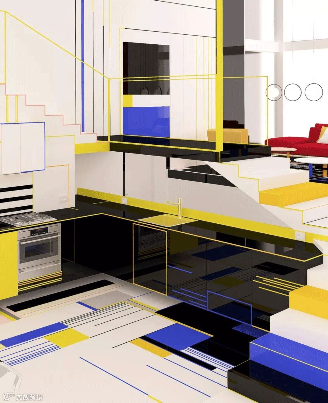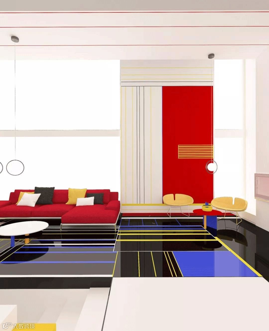 通过经典的黑白几何图案以及红、蓝、黄三色颜色和线条之间的表现力,塑造空间层次关系。
