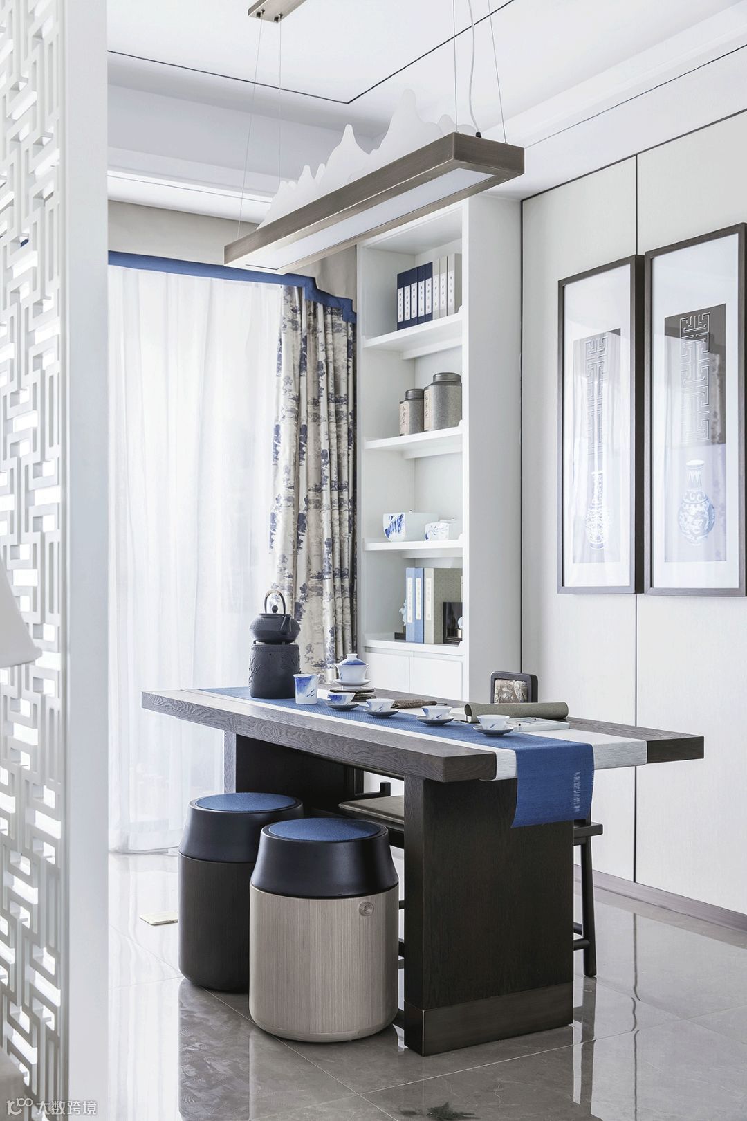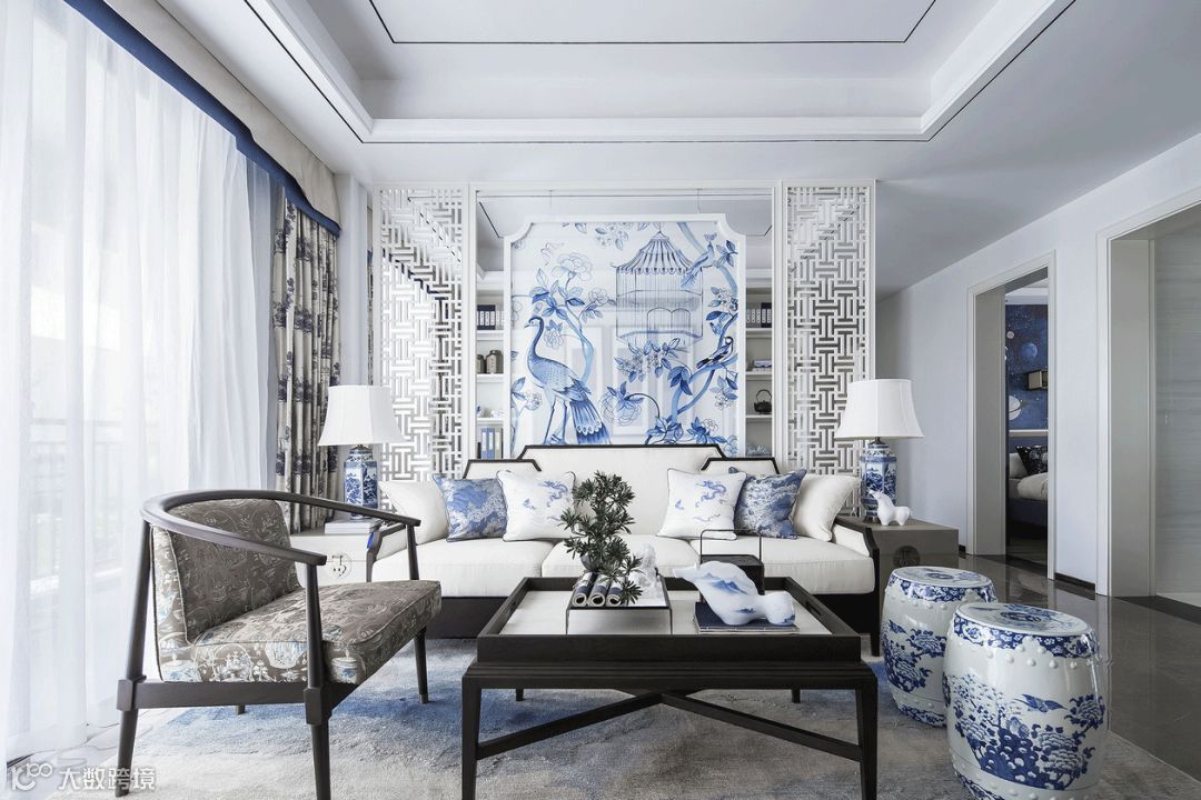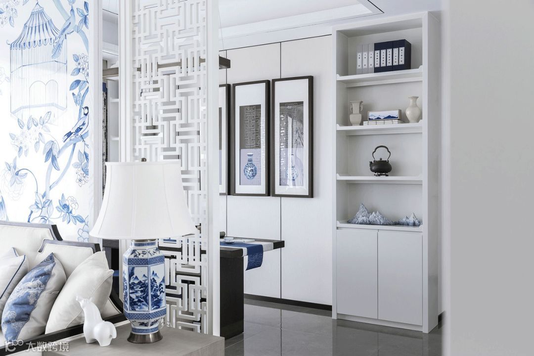 此“青花案”设计即使没有过多惊艳的色彩进行情感表达,清冷的单色也可以通过软装材质凸显色彩的力量。