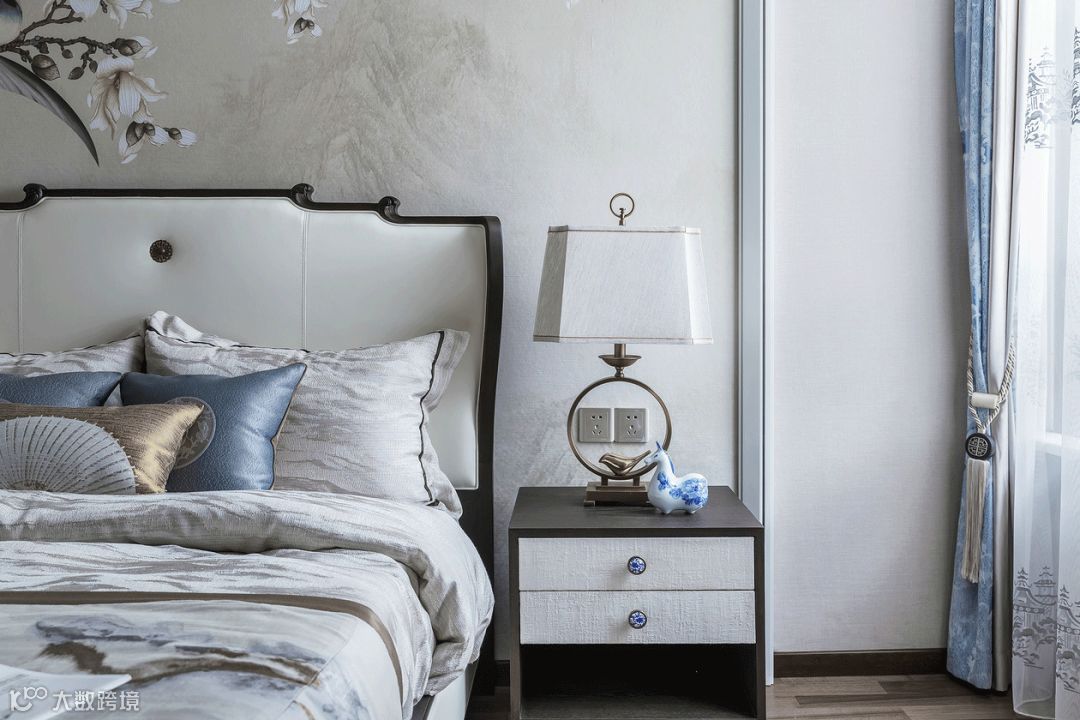 整个空间软装搭配多以“刺绣”的立体感与“丝绸”的柔滑感来凸显“青花蓝白”色彩的高贵质感。