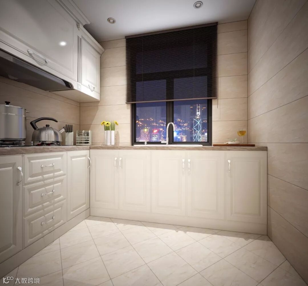 厨房墙壁装饰了橱柜,储物空间丰富。白色木质橱柜,搭配大理石操作台,经典的色调和材质搭配,缔造美味制作的天堂。