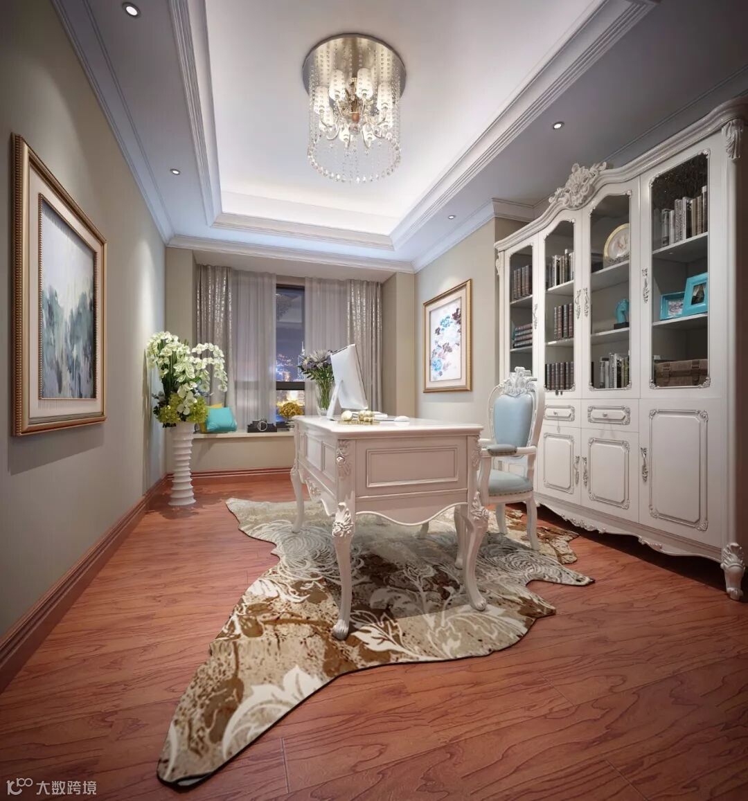 书房让人眼前一亮的是颜色的搭配,象牙色的墙壁和白色的摆设,给人一种柔和内敛的感觉,和传统的欧式极端奢华形成对比。