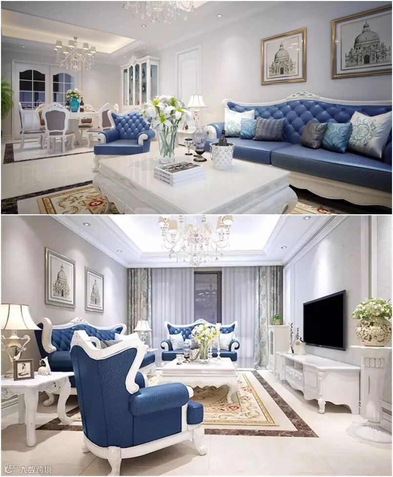 整体色调为白色,糅合适当的金、蓝色点缀,使空间给人以开放、宽容的非凡气度。家具和配饰,表现手法极具艺术美感,或精雕细琢,或镶花刻金,既摒弃了过于复杂的肌理和装饰,又能与生俱来的奢华感。