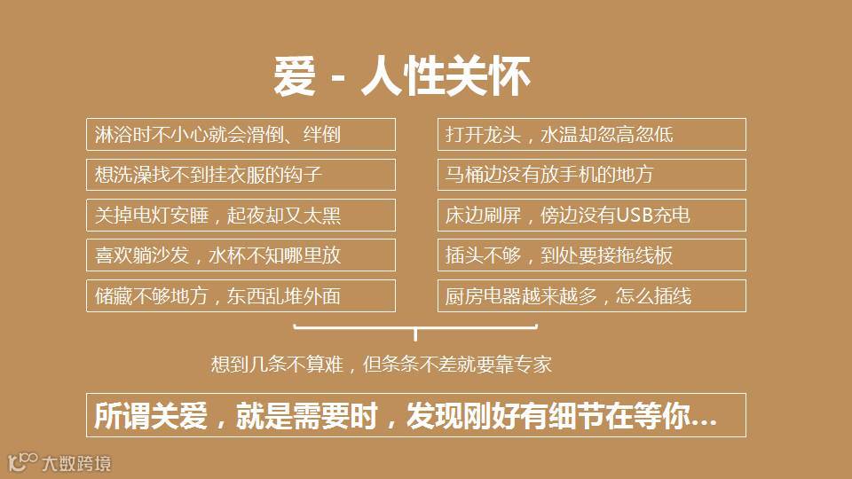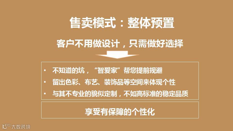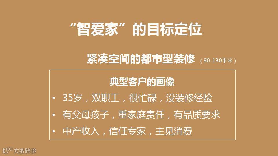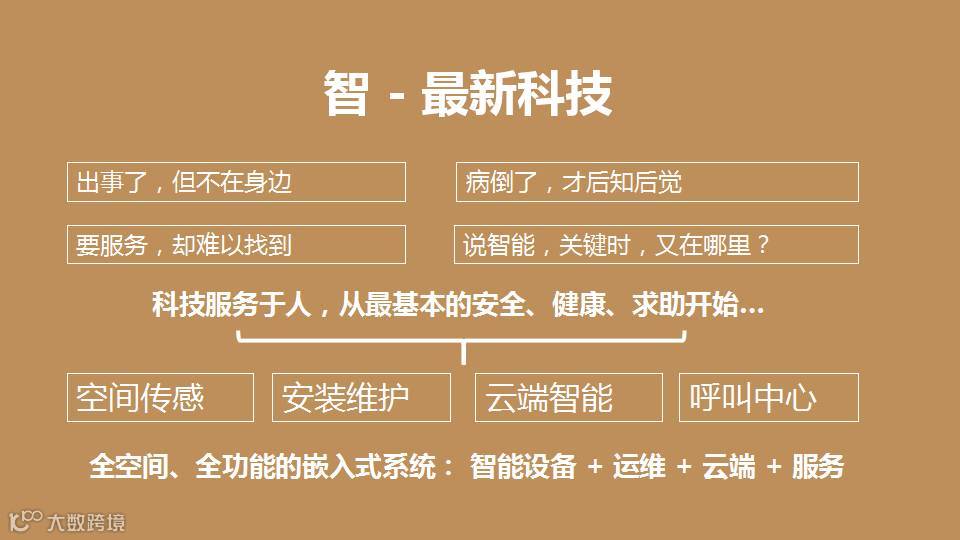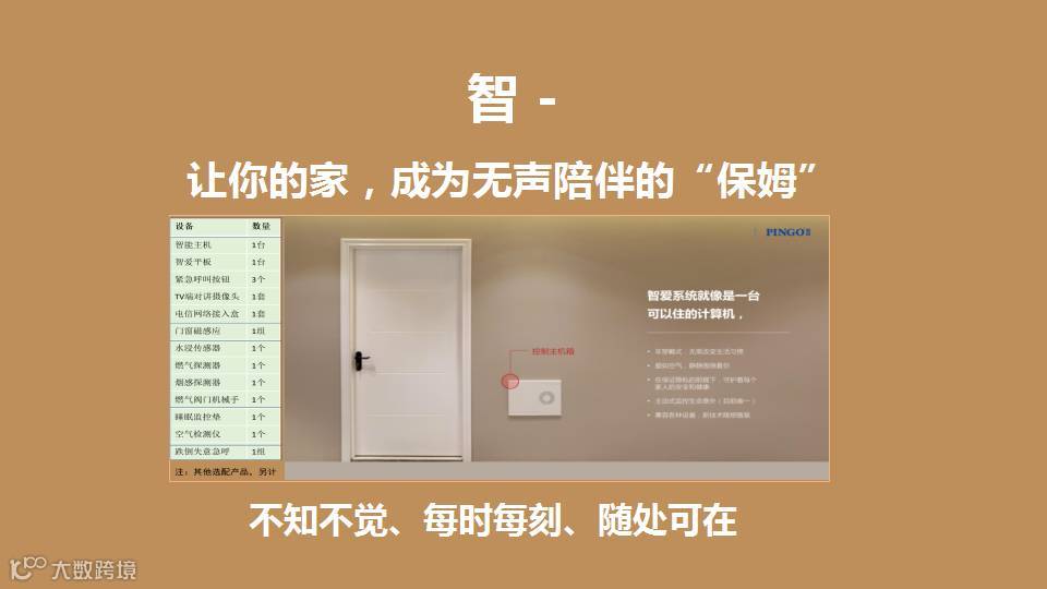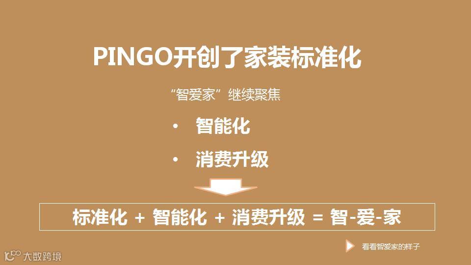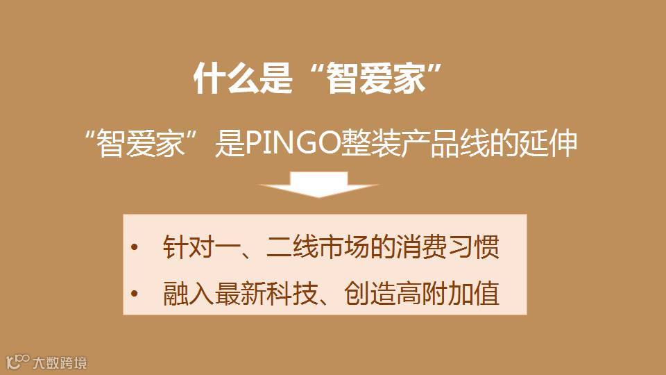 “智爱家”是PINGO国际迎合智能化和消费升级的市场趋势,融入最新科技、赋予高附加值的最新产品,其市场定位于对家居智能化要求较高的一二线城市,锁定空间紧凑的都市型装修,从装修进场阶段就系统化安装智能设备,包括全屋感应、信息传输、中央处理器、云平台、后台传呼中心,共同组成房屋和生活互联的大系统,对有害空气、睡眠习惯、健康意外、火警水警等能够主动识别和呼叫应对。