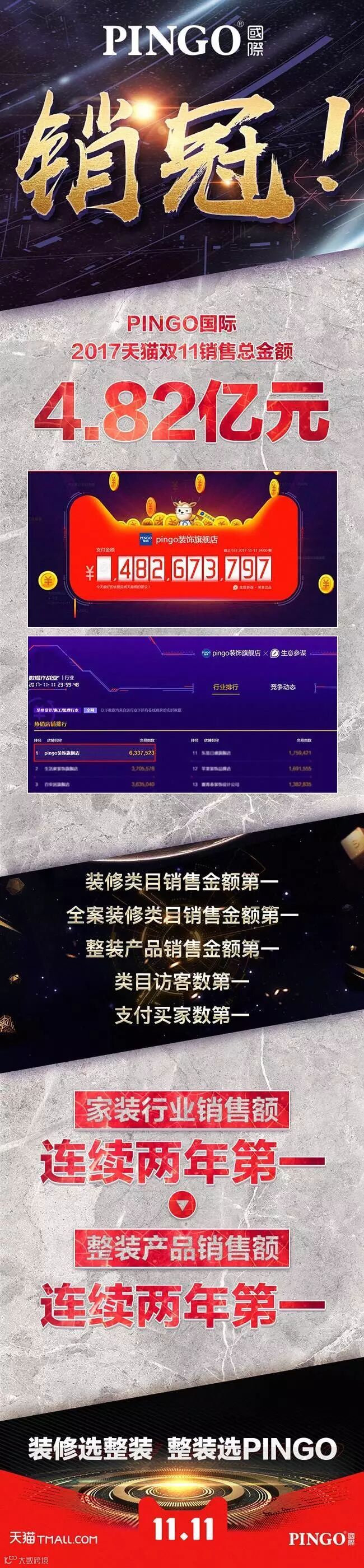 3.5亿!4亿!4.82亿!2017年11月11日晚23:59,随着一个个不断刷新的数字渐渐停止跳动,家居行业的“双11”大战宣告收官,各品类的销冠纷纷出炉,在最为引人瞩目的家装领域,泛家居创新标杆品牌PINGO国际以4.82亿元的成交额名列榜首,继去年夺冠后继续蝉联天猫“双11”家装类销售冠军。