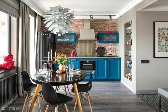 空间较小的开放式厨房,可以只选择一面墙打造裸砖墙,这个餐厨一体的厨房面积虽不大,各种功能却一应俱全,大胆运用蓝色,提亮了整个空间。