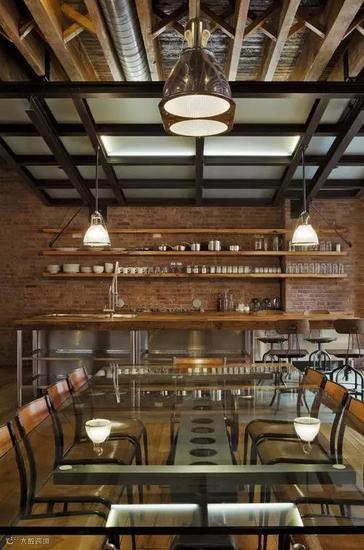 Loft风格的厨房,砖墙和木头、金属、玻璃的材质搭配出酷酷的工业风,吊灯的使用让这个偏暗的空间更加明亮。
