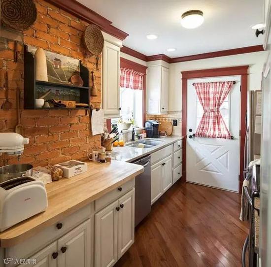 白色厨房加入一面裸砖墙,草帽样子的装饰,搁板后面静谧的装饰画,还有木质的案板,让厨房散发出自然原始的乡村风气息
