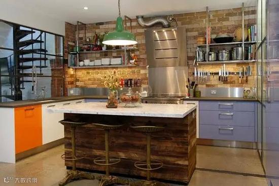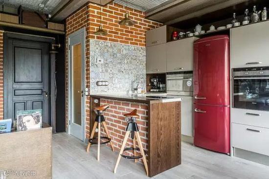 在裸砖墙厨房里加入一些跳跃热烈的色彩,可以让原本略显平淡和冰冷的空间变得更加温情生动。
