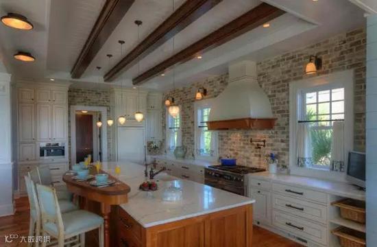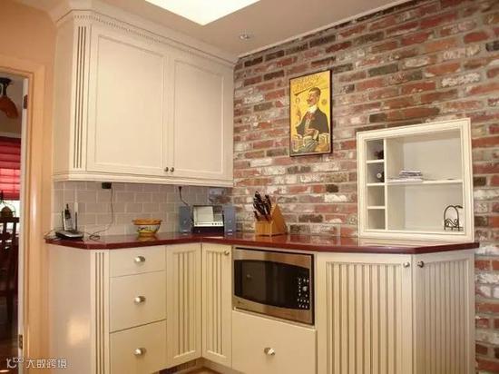 打造一个裸砖墙厨房,灯的运用极其重要,可以多使用射灯,增加照明强度,让厨房更加亮敞。