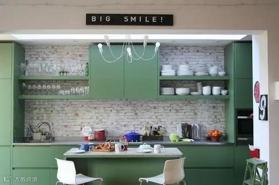 裸砖墙并不一定是完全裸露,粉刷上白色,和淡绿色的橱柜搭配在一起,清新灵动。