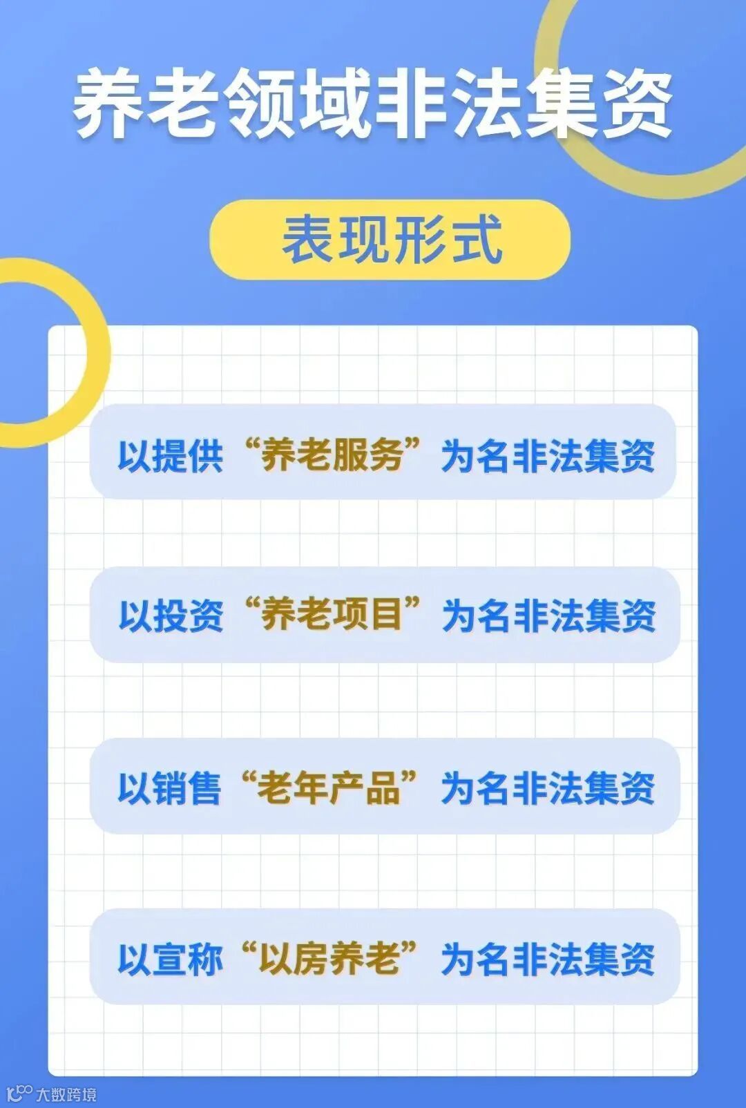 近期,一些机构和企业打着“养老服务”“健康养老”等名义,以“高利息、高回报”为诱饵实施非法集资活动吸收老年人资金,给老年人造成严重财产损失和精神伤害,存在重大风险隐患。