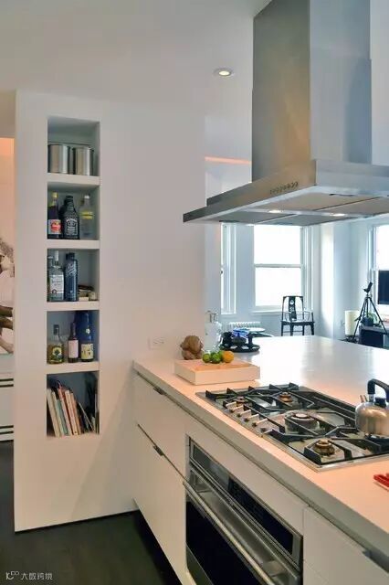 ▲如果家里人口较少,开伙的次数也比较少,直接在墙体做长形的开放式收纳龛。其它空间做留白,实用又美观。