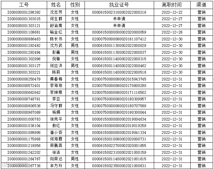 本次公示离职人员包含营销渠道112人,银保渠道18人,保费渠道4人,共计134人。公示的信息包含离职人员工号,姓名、性别、执业证号码以及离职时间。