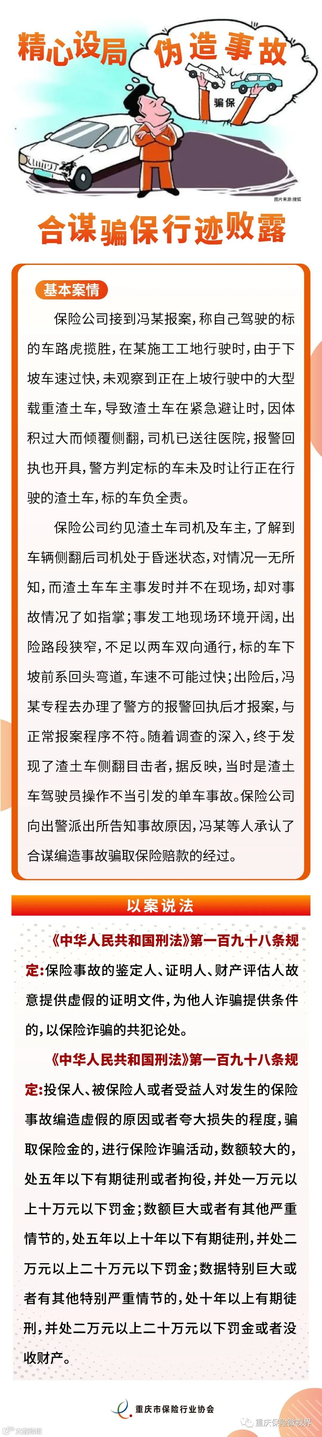 近年来,在国家金融监督管理总局重庆监管局的指导下,重庆保险业积极构建反保险欺诈信息共享平台,强化大数据和科技手段应用,持续深入推进反保险欺诈工作,取得了较好工作成效。为进一步增强社会公众对保险欺诈严重性的认识,充分了解实施保险欺诈需要承担的法律后果,主动提升防范保险欺诈的风险意识,严厉打击保险欺诈违法犯罪行为,重庆市保险行业协会面向全市68家保险公司征集了2022年度保险反欺诈典型案例,结合社会影响、案件情节、作案手段、涉案金额及险种等多维度因素,最终评选出十起较为典型的反保险欺诈案例。