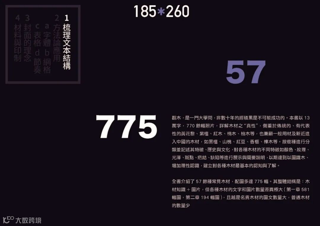 深呼吸之後,靜下心來分析文本結構,57種木材,775幅圖片,無所不在的圖表……先大致梳理出圖文比例,和大多數圖片的縱橫方向,試排樣張找找感覺,再跟編輯討論一個合適的開本。