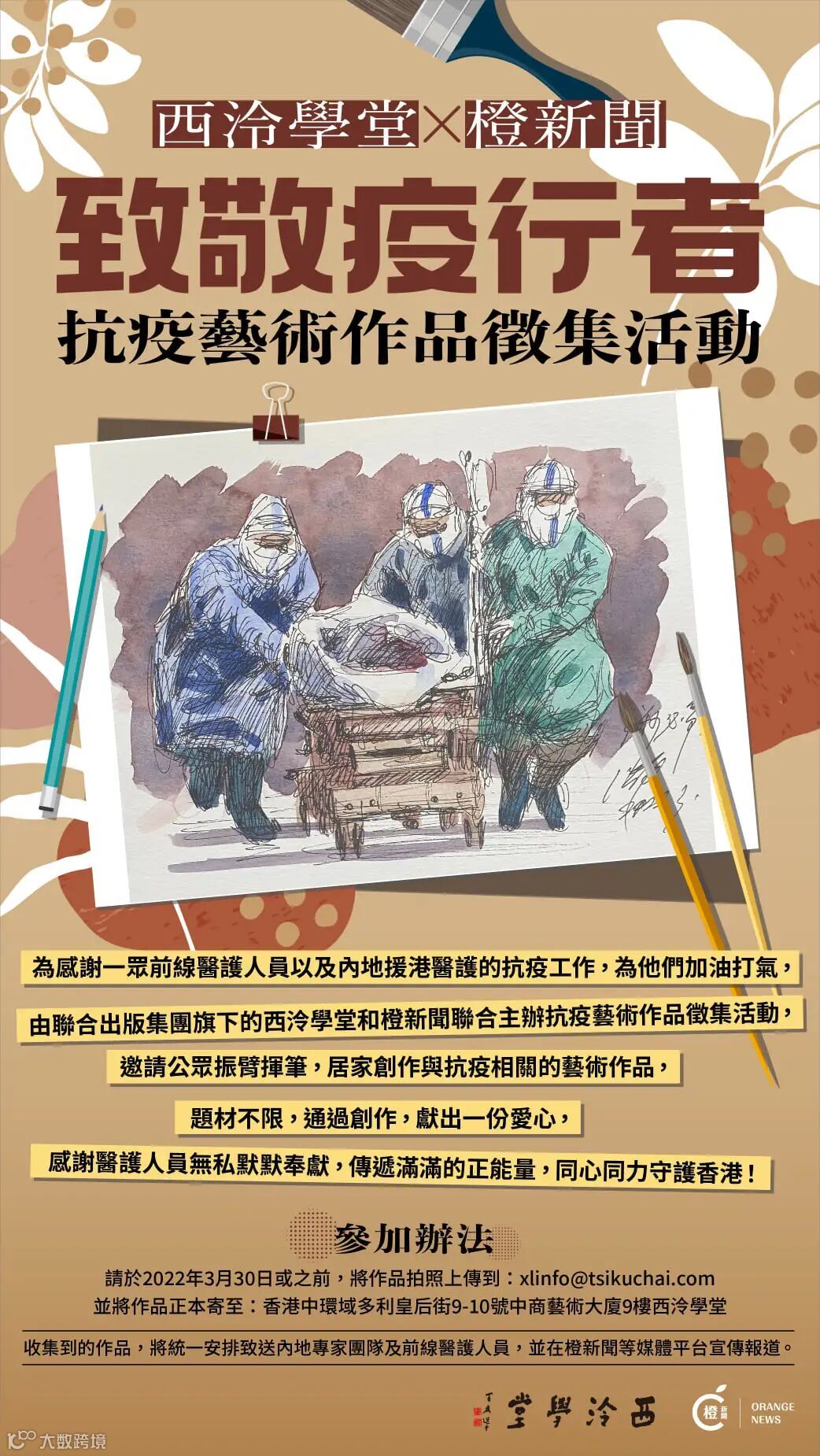 2022年3月起,西泠學堂和橙新聞聯合主辦「致敬疫行者|抗疫藝術作品徵集」公益活動,邀請西泠學堂師生及藝友振臂揮筆,居家創作抗疫藝術作品致送給前線醫護人員,用藝術作品凝聚社會正能量,致敬每一位平凡又勇敢的抗疫工作者,感謝他們無私奉獻,為香港抗疫加油打氣。
