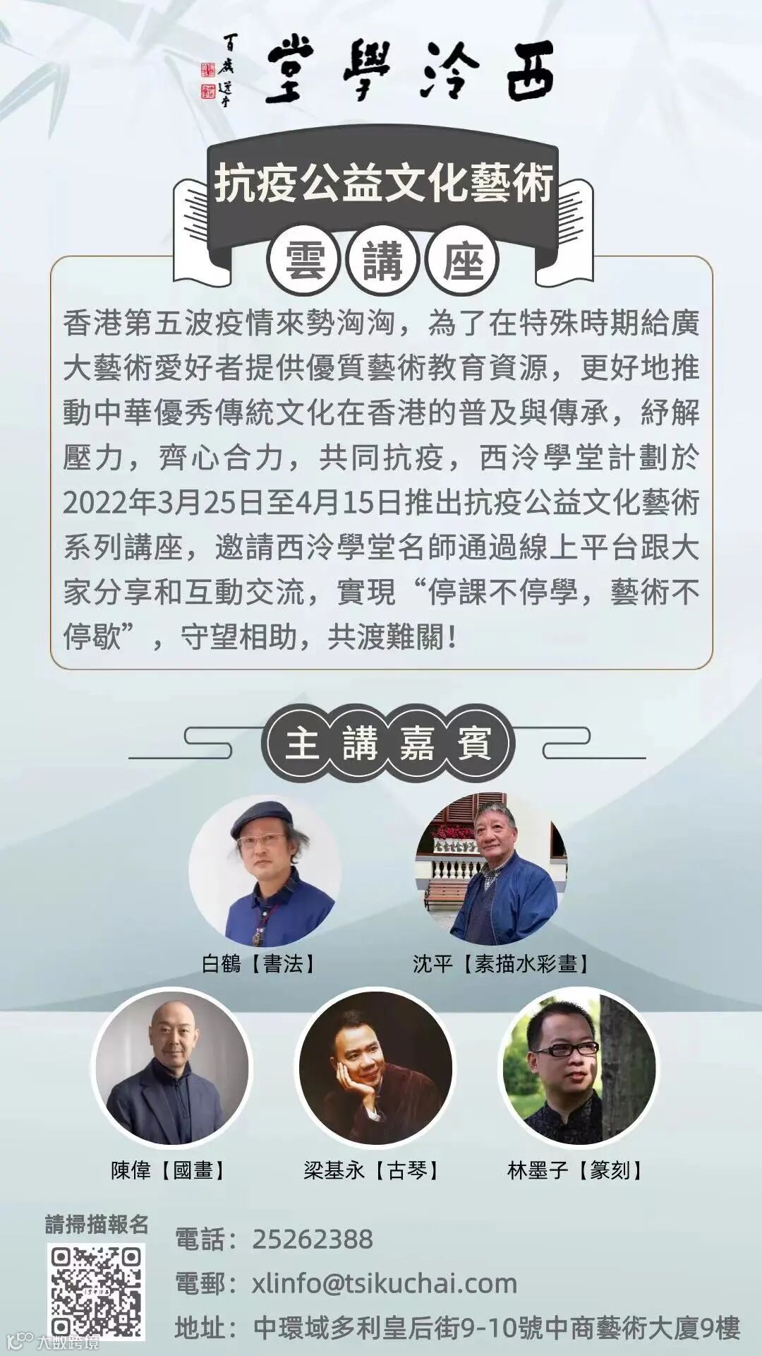 為了在特殊時期給廣大藝術愛好者提供優質藝術教育資源,更好地推動中華優秀傳統文化在香港的普及與傳承,紓解壓力,齊心合力,共同抗疫,西泠學堂繼「致敬疫行者|抗疫藝術作品徵集」公益活動後,於2022年3月25日至4月15日推出抗疫公益文化藝術系列講座,邀請西泠學堂書法、國畫、篆刻、古琴、素描水彩畫等名師通過線上平台跟大家分享和互動交流,實現「停課不停學,藝術不停歇」,守望相助,共渡難關!此次抗疫系列講座共有近千名觀眾報名收聽,得到廣大藝術愛好者的眾多好評,反響熱烈!