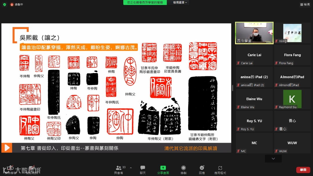 第四場講座邀請到西泠學堂特聘篆刻導師林墨子先生,以「篆刻收藏及藝術價值體現」為題,分享其篆刻教學的心得。篆刻藝術是書法、章法、刀法三者完美的結合。林老師先淺述了篆刻的文化知識概括,從篆刻的歷史文化講起,讀篆刻史的過程就是了解和分析歷史的過程,有了對篆刻演變發展的了解,才會對不同時代、不同風格的作品有比較客觀的認識。接着向大家示範講解摹印、刻印的一般步驟及相關知識,淺論了元明時期文人篆刻的萌芽發展,通過對不同篆刻派系篆刻作品的講解分析,闡述了篆書與篆刻兩者的關係,「書從印入、印從書出」,二者相輔相成。講座最後林老師與大家分享了自己的篆刻作品,希望喜愛篆刻的朋友能夠參與到篆刻藝術的隊伍當中,感受源遠流長的篆刻文化,感受「方寸之間,氣象萬千」的魅力。