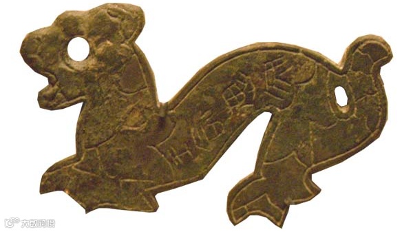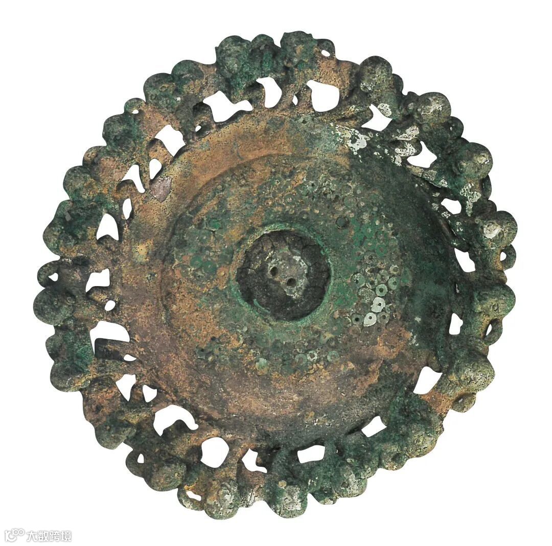 此銅飾的中央原應嵌有一寶石扣,周圍還鑲有小圓點綠松石。銅飾邊沿鑄出互相纏繞的猴子二十隻,相互纏繞,各具情態,十分生動有趣。此飾品用途類似「護身鏡」,使用時佩帶在腹部腰帶之下。中國人自古愛「猴」,猴與「侯」同音。「侯」是古代爵位,古人希望升官封侯,猴便成了象徵升遷的吉祥物,自然而然地成為古代工匠師繞不開的動物造型。