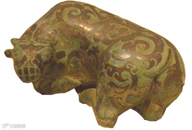 青銅卧牛作蟠伏顧首狀,形態逼真,栩栩如生。牛身有錯銀雲紋,不僅動感十足,而且充滿神祕氣氛。腹下刻有「大府之器」銘文。「大府」是王室掌管財幣貨藏的機構,掌管四方向王室進貢的「貨賄」,同時在王進行賞賜時負責從府庫中搬取、清點賞賜品。此器當是大府所藏專供王室使用的器物,故造型製作都異常精美。青銅卧牛為席鎮。古人跪坐於地、床、榻等,上必鋪席。為了避免起身落坐時折捲席角,需要重物將其四隅壓鎮。