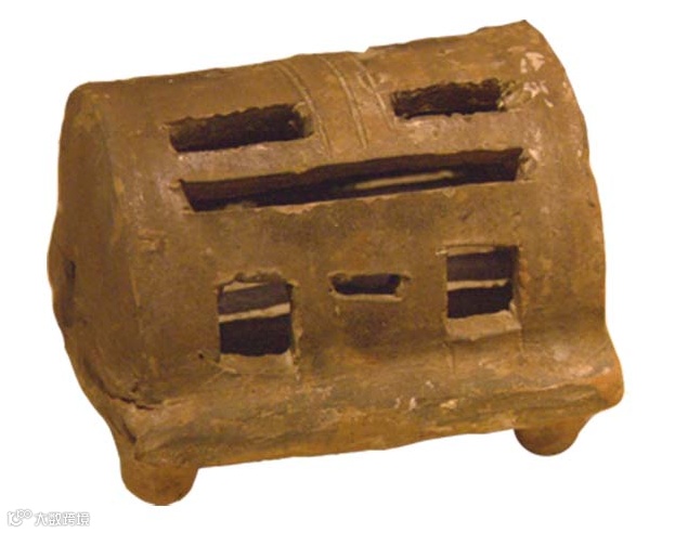 該器胎色灰青,釉色青綠中帶黃,釉層薄,勻淨明亮,為越窯早期產品。捲棚式籠,呈倒置的半圓形,籠的上部是八個透空的長條形孔,下設長方形平台,籠的正面有兩個半圓形小門,籠內兩雞卧伏在地,伸頸向外凝視。