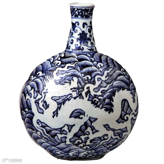 器圓口微外撇,長頸自上至下漸闊,扁圓式腹,橢圓形淺圈足。口邊、頸部白地青花繪捲草紋和纏枝蓮紋,腹部青花滿繪海水紋為地,刻畫二條白色行龍,回首觀望,奮爪騰身,履水而前,頗有「驚濤拍岸,捲起千堆雪」之感,更襯托出游龍的凶猛強悍。