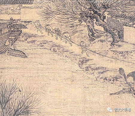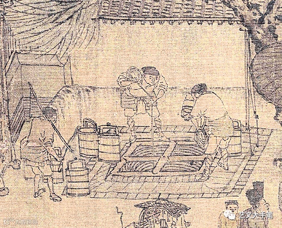 這是汴梁城內的一口水井,有人正在汲水。柳永的詞作廣為流傳,被稱為「凡有井水處,皆能歌柳詞」。不知畫面中這幾位汲水者,會不會正在吟唱着柳永的名句「忍把浮名,換了淺斟低唱」,「衣帶漸寬終不悔,為伊消得人憔悴。」 |