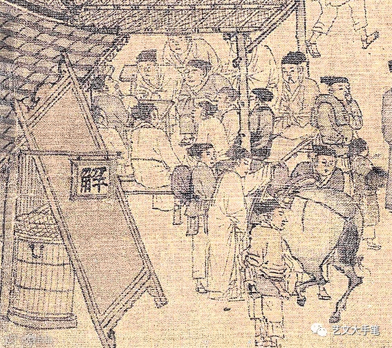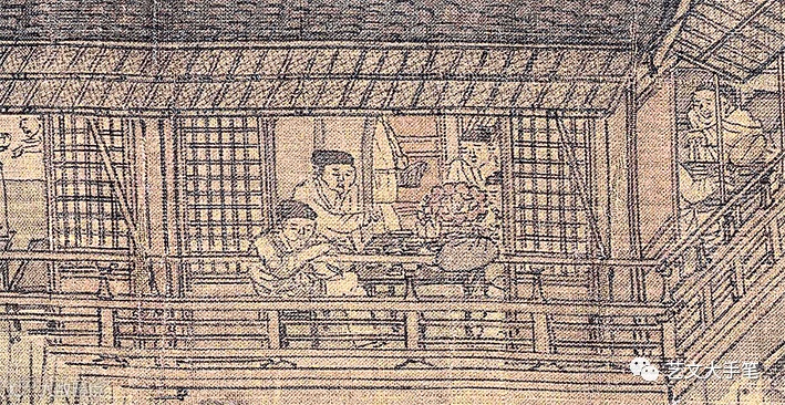 「十千腳店」是畫中一座比較高檔的酒樓,透過二樓雅間的窗戶,可見幾個酒酣耳熱的食客,以及桌上的注壺。「腳店」就是客店,「十千」或許是取自李白「金樽清酒鬥十千,玉盤珍羞直萬錢」的詩意。這樣的地方,力夫們是消費不起的。 |