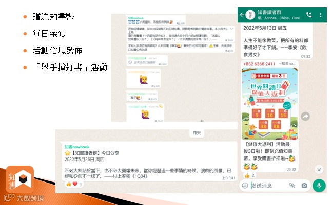 從主動變為被動方面,「知書」嘗試了不同互動方式,包括贈送知書幣、發布每日金句、活動信息及「舉手搶好書」活動等,由用戶被動接收「知書」發送的內容。