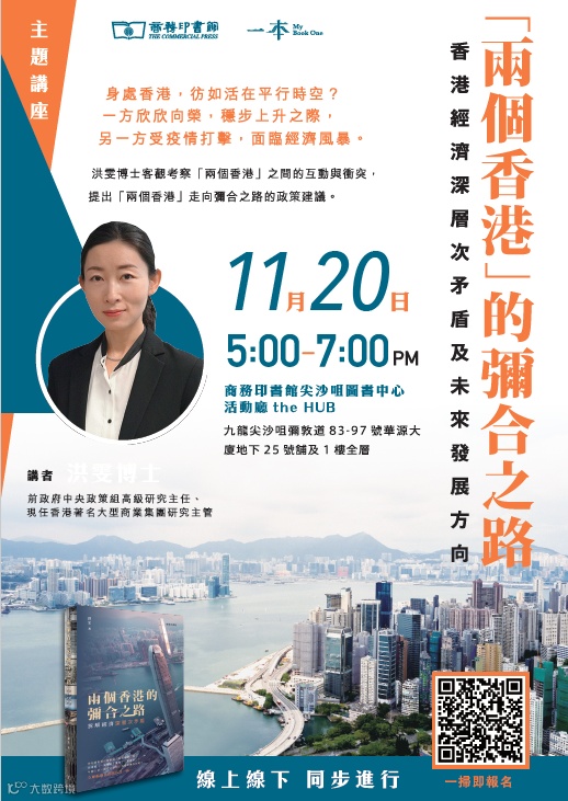 想更直觀地檢討各種香港深層次問題,把握時代發展機遇?11月20日,《兩個香港的彌合之路》的作者洪雯博士——前政府中央政策組高級研究主任、現任香港著名大型商業集團研究主管,將擔任商務印書館尖沙咀圖書中心新書分享會主講嘉賓,客觀考察「兩個香港」之間的互動與衝突,提出「兩個香港」走向彌合之路的政策建議。活動現場有本書的簽名環節,感興趣的讀者請不要錯過!