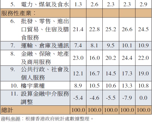 2018年,服務業在香港總體經濟中的比重達到93.1%,在全球絕無僅有。相較其他規模和功能近似的經濟體包括新加坡和瑞士,其服務業佔國內生產總值的比重,分別只有約70%和74%,第二產業比重超過兩成,結構比香港多元得多,也穩健得多。