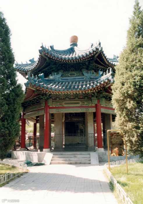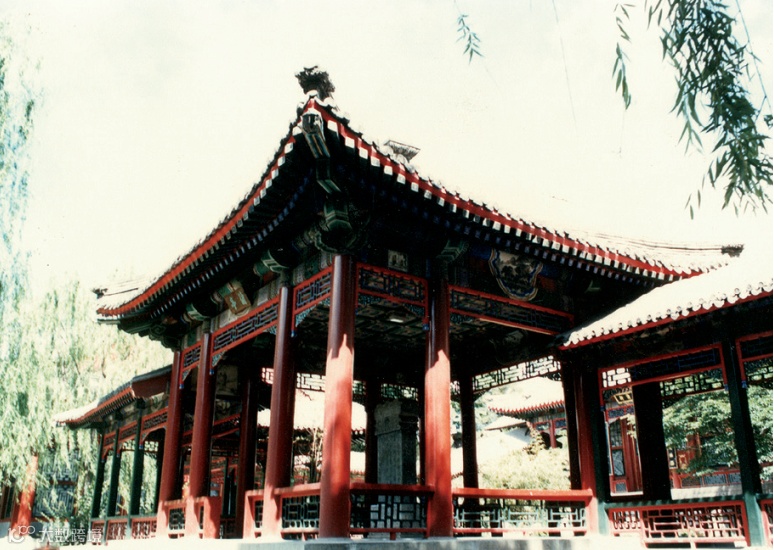 又如在北京中山公園內,也有一處中式八角的蘭亭,原來在亭內有一塊乾隆時刻的《蘭亭修禊圖》石屏。據說,此屏原為圓明園中的「坐石臨流」景亭,僅有軒宇三楹,有溪水環流,可以流觴,後來將池遷至中山公園時,將亭子改建為八角,名曰蘭亭,乾隆還為之賦詩曰: