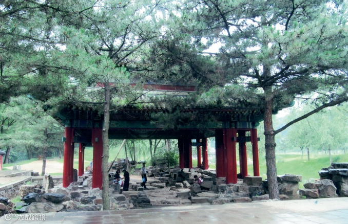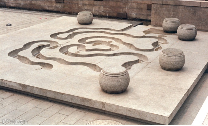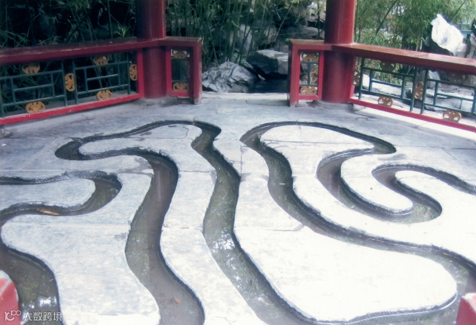 三、完全作為「曲水流觴」象徵性的表象。在公園設計中,往往因設計意圖的需要或受具體用地的影響限制,而產生一種「曲水流觴」的舉措,有「曲水流觴」之意旨,卻無「曲水流觴」之實況設計,但又製造出一種象徵「曲水流觴」的圖識。