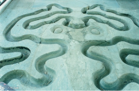 二、將「曲水流觴」活動濃縮於一亭之地面,而成為一種特殊的流杯亭,將大自然的自然小溪流,變成人工造型的「虎」字、「佛」字、「龍」字等小水槽。