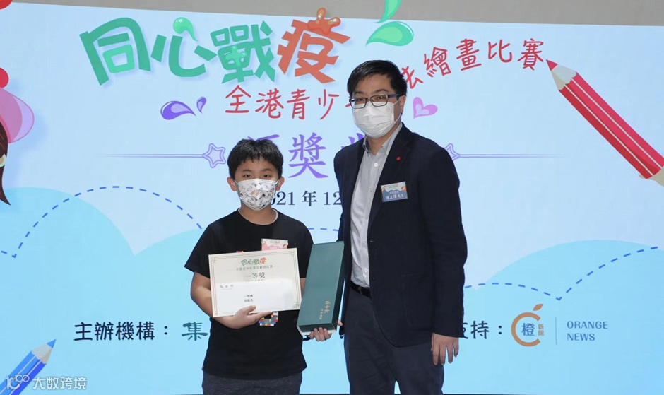 圖 | 雲通科技副總經理兼副總編輯、橙新聞總監陳正偉(右)頒發獎狀和獎品予書法小學組一等獎獲得者張敬浩
