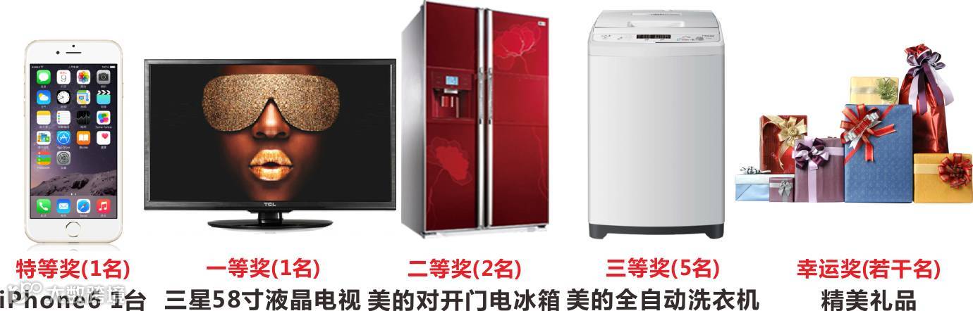 活动现场参加豪华家电大抽奖,电饭煲,挂烫机,微波炉,液晶电视,全自动洗衣机,电冰箱,iPhone6......等您来拿。