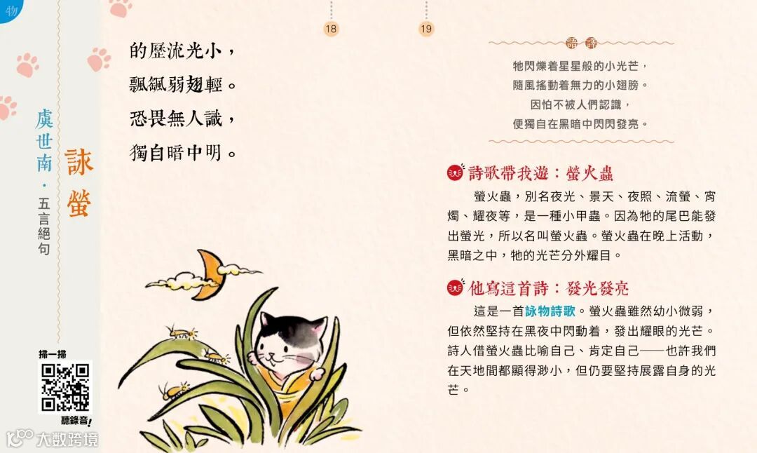 最後,在表述手法方面,除了文字,我們還邀請了葉愷璵、楊樸摯兩位小朋友參與,替這一百首詩歌錄製粵、普音頻。孩子只要用手機掃一掃頁面上的二維碼,就能直接連結到音頻,一邊聽着兩位雖不甚標準卻天真爛漫地朗讀詩歌,一邊感受詩歌的優雅。