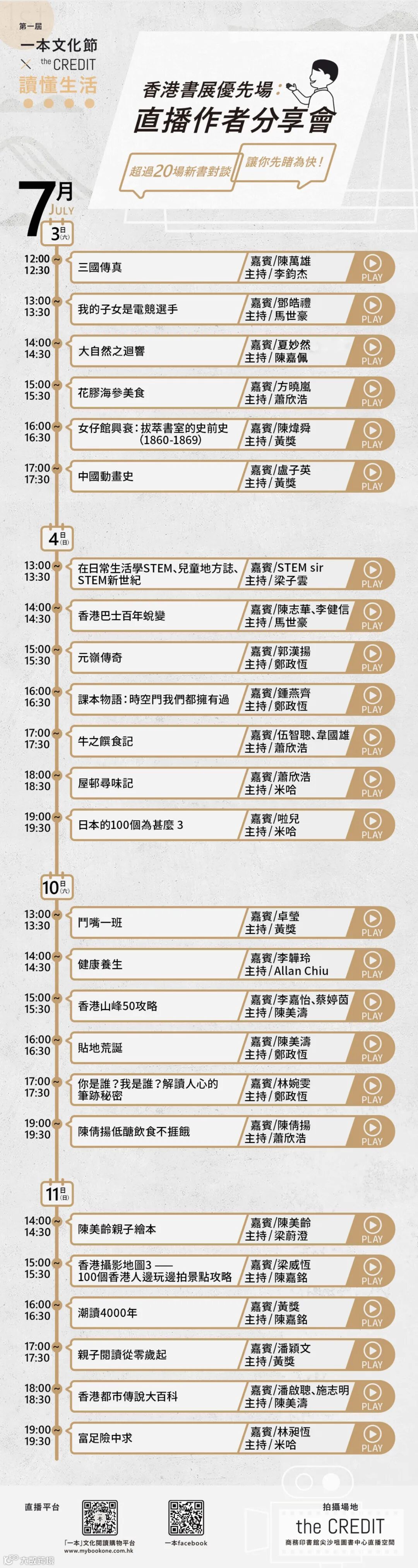 7月3日至4日,10日至11日,一連兩個周末,超過25場在線直播活動,在新店直播間the CREDIT舉行。文化、歷史、藝術和心理學領域的多位重磅講者將與讀者分享新書創作的有趣故事,提前揭秘今年香港書展不該錯過的好書。