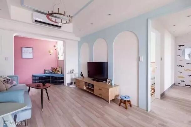 玄关的粉色墙面与客厅的浅蓝色沙发好似主旋律,各自在各自空间中“独霸一方”,清新又不失温馨!