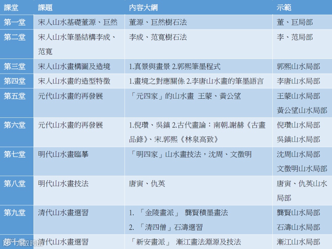 培訓內容:課程將帶領學員從臨摹規範入手,逐一步驟解構山水皴法要素及強調運筆節奏和技法表現,課程有大量的近距離鏡頭示範,清晰展示行筆執筆要訣和山水畫圖形造勢構成理念。導師同時也會根據課程指引進行主題創作引導,幫助有基礎學員從臨摹一步步走向創作。